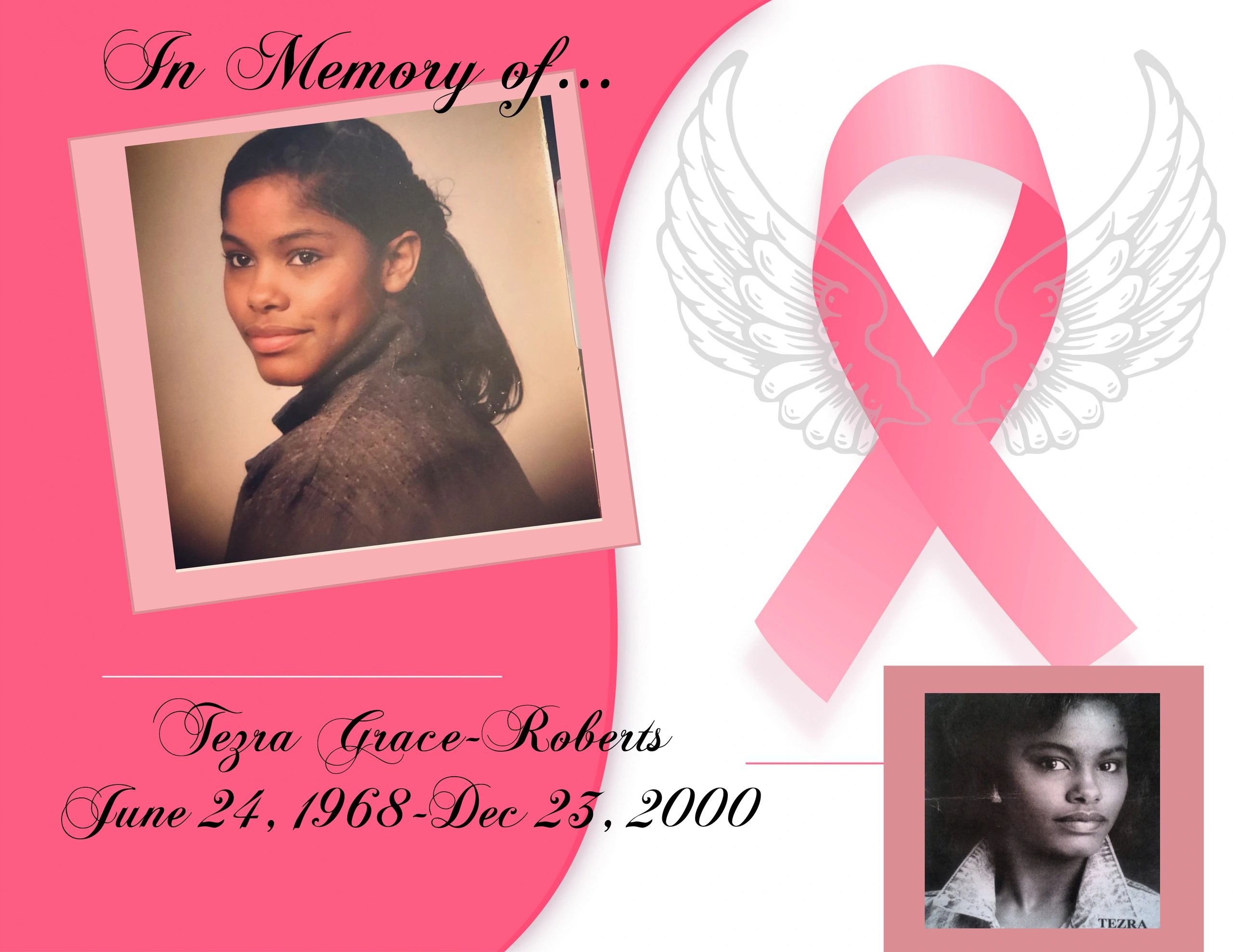 After being diagnosed in 1998 Tezra stood on her most holy Faith, praying and believing and seeking God for complete healing. Her spirit was like no other as it could not be broken; as she was always flashing her million dollar smile that brightens a gloomy day. She loved God and praised him continuously.